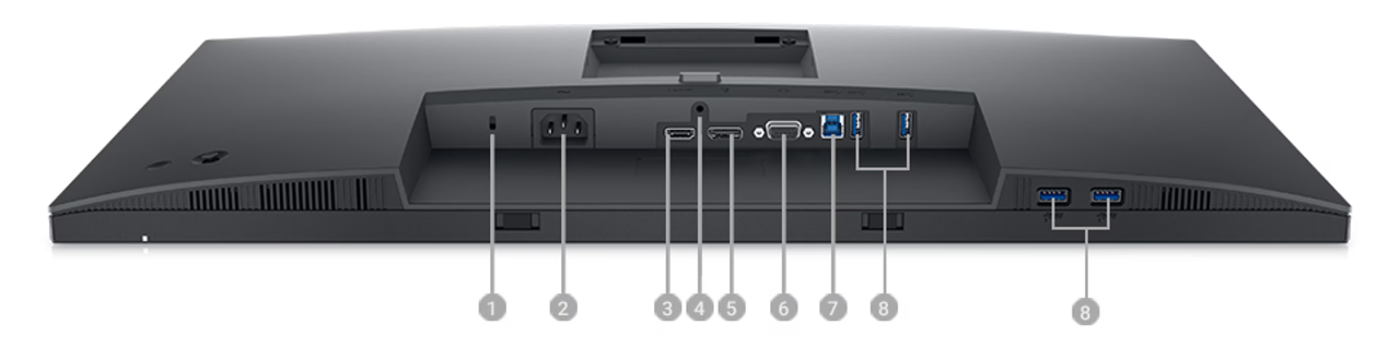 1. Security lock slot | 2. Power connector | 3. HDMI port | 4. Stand lock | 5. DisplayPort | 6. VGA connector | 7. USB upstream port | 8. USB downstream ports (4)