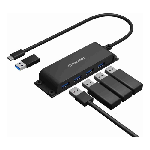 [MB-HUB-E04] mbeat Mountable 4-Port USB-A USB-C Adapter Hub - 60cm Data Cable, USB 3.0, 2.0 High-Speed Data Port Expansion, Save Space Mounting Solution
